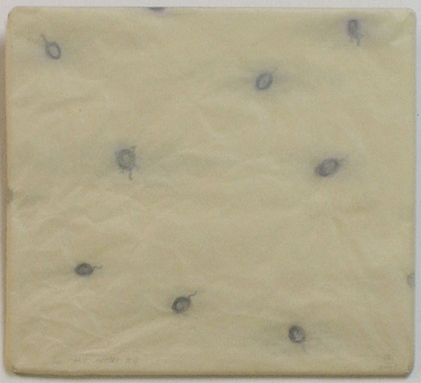 下地処理した板の上にドットをドローイングし、その上にゆったりと雁皮紙を被せ、紙からうっすら透けて見えるドットの上からオタマジャクシの形態を描き重ねたもの。抽象的な図像に具象的な図像を重ねている。