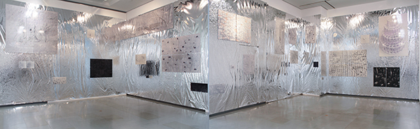 展示室の壁面をミラーフィルムで覆い、透明のグルーガンで描いていった。ミラーフィルムはグルーガンの熱によって縮み、光を複雑に拡散し、像を無数に反射させる空間となった。