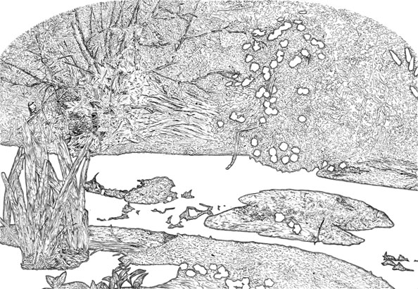 ミレイの《オフィーリア》をモチーフにした作品《(12-3) OPHELIA》のドローイング。水面や花、オフィーリアの顔や手が空白になっている。