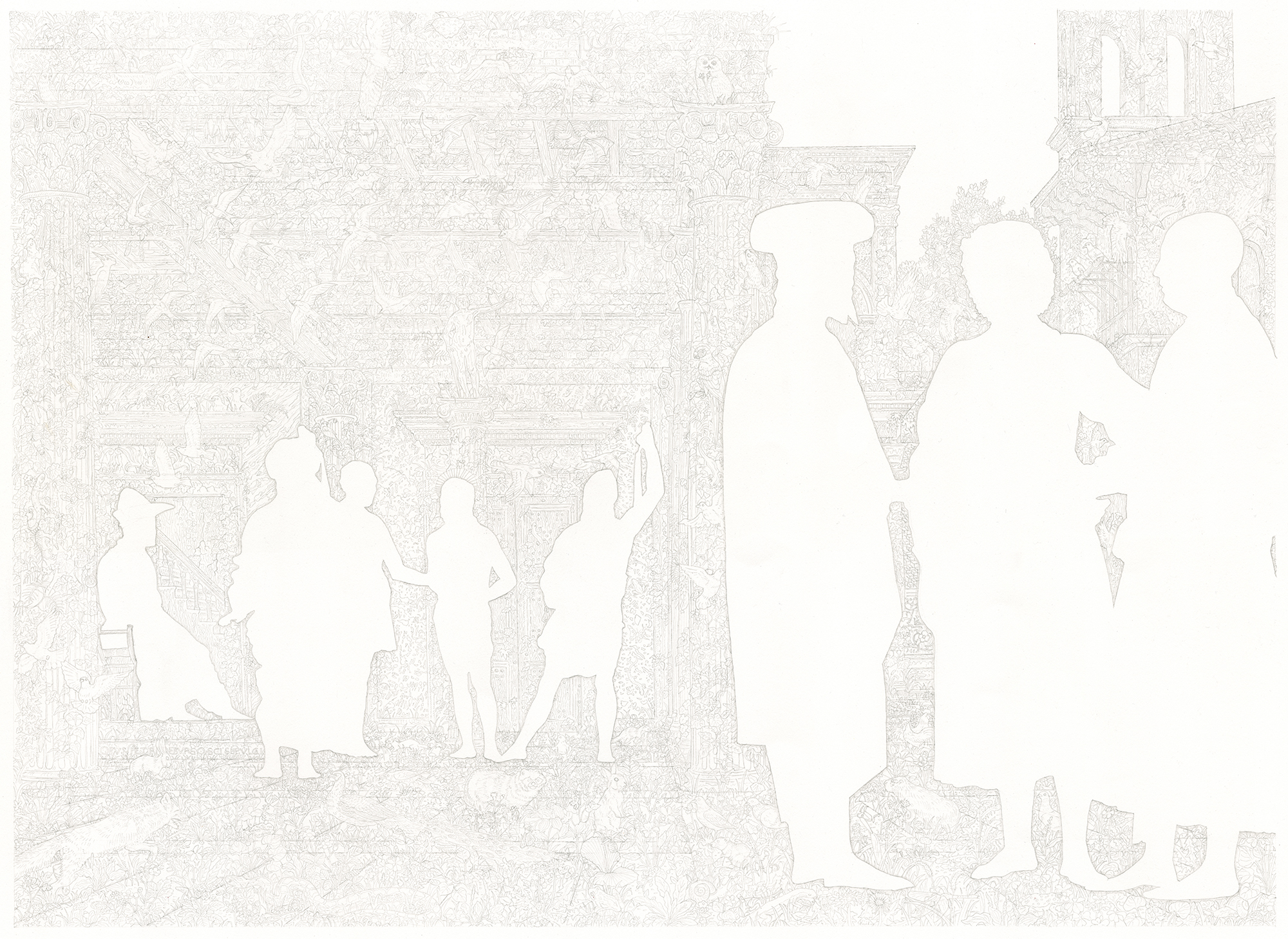 ピエロ・デラ・フランチェスカの《キリストの鞭打ち》をモチーフにした作品。画中の人物を空白とし、それ以外の部分には、元の絵にはない植物や動物の描写で埋め尽くした。離れて全体を眺めると人物の白いシルエットとグレーのトーンになり、近づいて凝視すると、細部の描写は見えるが、元絵となるピエロ・デラ・フランチェスカの作品の全体像のイメージは失われ、人物の部分は何も描かれていない紙の地であることに気付く。絵画を見るという行為は何を見ているのかを問う作品。