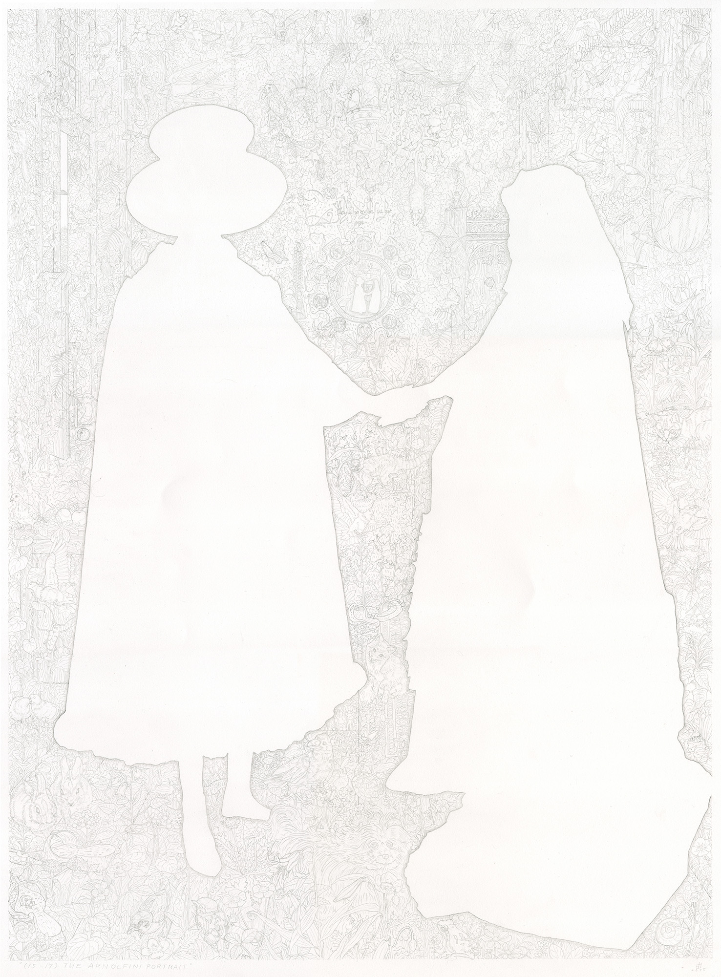 ヤン・ファン・エイクの《アルノルフィーニ夫妻の肖像》をモチーフにした作品。画中の人物を空白とし、それ以外の部分には、元の絵にはない植物や動物の描写で埋め尽くした。離れて全体を眺めると人物の白いシルエットとグレーのトーンになり、近づいて凝視すると、細部の描写は見えるが、元絵となるヤン・ファン・エイクの作品の全体像のイメージは失われ、人物の部分は何も描かれていない紙の地であることに気付く。絵画を見るという行為は何を見ているのかを問う作品。