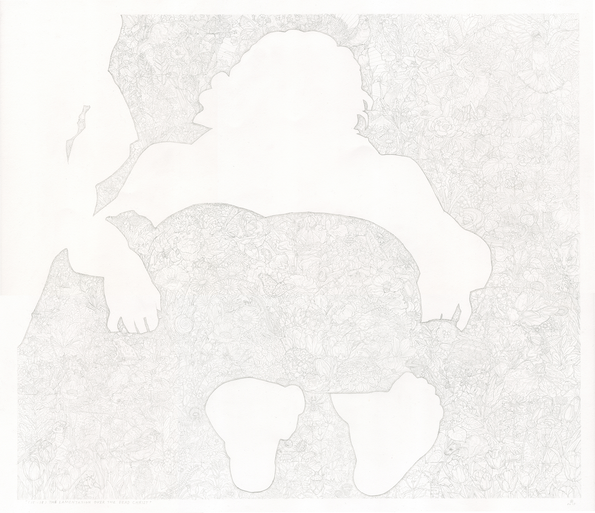 マンテーニャの《死せるキリスト》をモチーフにした作品。画中の人物を空白とし、それ以外の部分には、元の絵にはない植物や動物の描写で埋め尽くした。離れて全体を眺めると人物の白いシルエットとグレーのトーンになり、近づいて凝視すると、細部の描写は見えるが、元絵となるマンテーニャの作品の全体像のイメージは失われ、人物の部分は何も描かれていない紙の地であることに気付く。絵画を見るという行為は何を見ているのかを問う作品。
