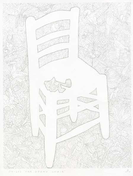 ゴッホの《ヴィンセントの椅子》をモチーフにした作品。画中の人物を空白とし、それ以外の部分には、元の絵にはない植物や動物の描写で埋め尽くした。離れて全体を眺めると人物の白いシルエットとグレーのトーンになり、近づいて凝視すると、細部の描写は見えるが、元絵となるゴッホの作品の全体像のイメージは失われ、人物の部分は何も描かれていない紙の地であることに気付く。絵画を見るという行為は何を見ているのかを問う作品。