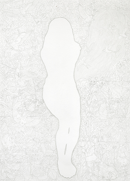 ムンクの《思春期》をモチーフにした作品。画中の人物を空白とし、それ以外の部分には、元の絵にはない植物や動物の描写で埋め尽くした。離れて全体を眺めると人物の白いシルエットとグレーのトーンになり、近づいて凝視すると、細部の描写は見えるが、元絵となるムンクの作品の全体像のイメージは失われ、人物の部分は何も描かれていない紙の地であることに気付く。絵画を見るという行為は何を見ているのかを問う作品。