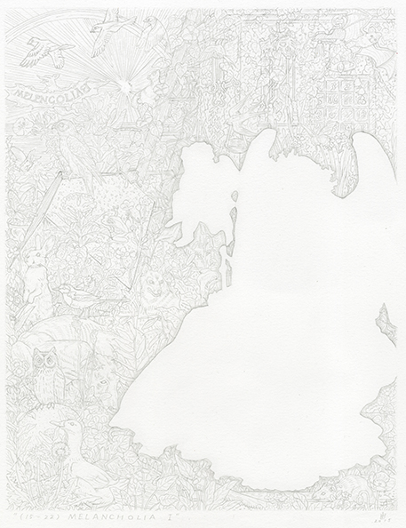 デューラーの《メランコリア I》をモチーフにした作品。画中の人物を空白とし、それ以外の部分には、元の絵にはない植物や動物の描写で埋め尽くした。離れて全体を眺めると人物の白いシルエットとグレーのトーンになり、近づいて凝視すると、細部の描写は見えるが、元絵となるデューラーの作品の全体像のイメージは失われ、人物の部分は何も描かれていない紙の地であることに気付く。絵画を見るという行為は何を見ているのかを問う作品。