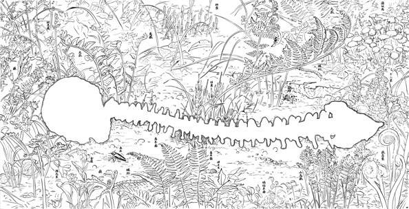 《(12-7) 人道不浄相九、散相》のドローイング。骨の周りに、人と自然の主従の転換、自然に還り再生するというような意味合いも含めて、春の植物や、シダ、こけ類や虫などを、空白の骨と密度の対比を意識して描いた。。忘れ去られた無名の人の骨に対比するように、それぞれの植物や虫には名前も書き込んだ。
