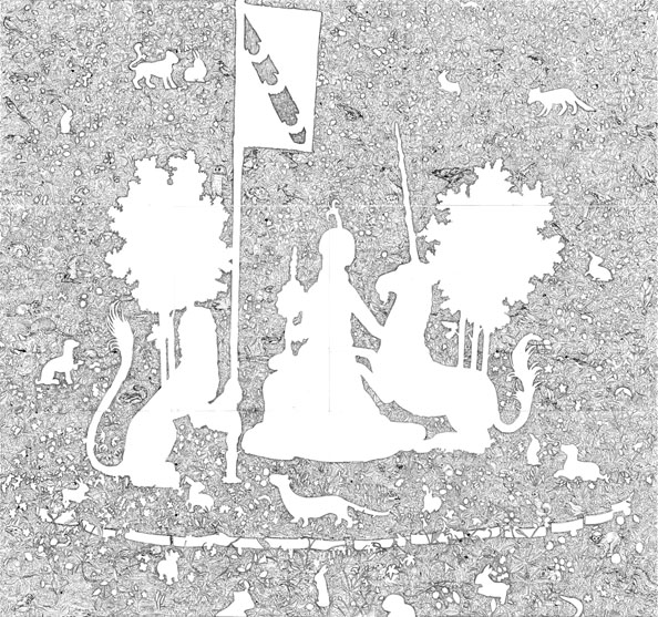 中世のタペストリー《貴婦人と一角獣》のうち、「視覚」を表しているとされている1点をモチーフにした作品《(11-7) THE LADY AND THE UNICORN - SIGHT》のドローイング。タペストリーで印象的な赤い背景の部分や、中央の黒い楕円形の島の様な、描写の無い箇所を中心に植物や動物などを細密に描写した。細密な描写(図)も均質にしていくと、部分の意味合いは弱まり、「地」の様になっていく。しかしタペストリーとは、隣り合う糸が順番に織られていくことで作られているので、実際は「描写(図)」とその下の「地」という関係は、作者の概念の中にのみ存在し、制作の工程には存在しない並列な関係の絵画である。