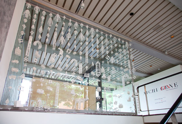受付後ろの大きなガラス面には天井から糸でオブジェを等間隔に吊るした。インタリオ・オン・フォトで制作しているものを実物で再現したような作品。インタリオ・オン・フォトで写真にあたる部分が実景、版にあたる部分がオブジェとなっている。