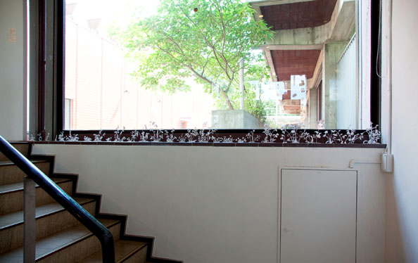 外の景色と中の立体をガラス窓を挟んで呼応させた。