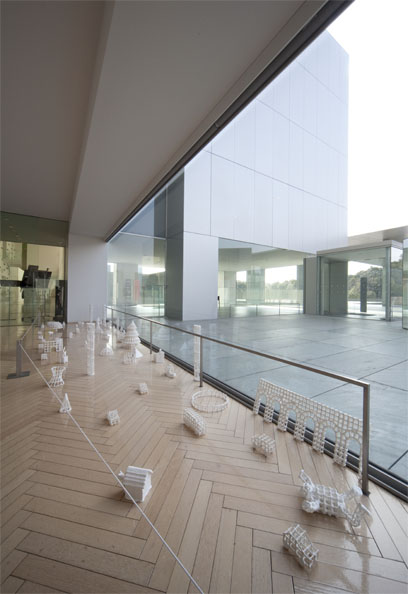 レストランエントランスのアプローチ。ガラス沿いに立体を並べる。外からも中からも眺められるようにした