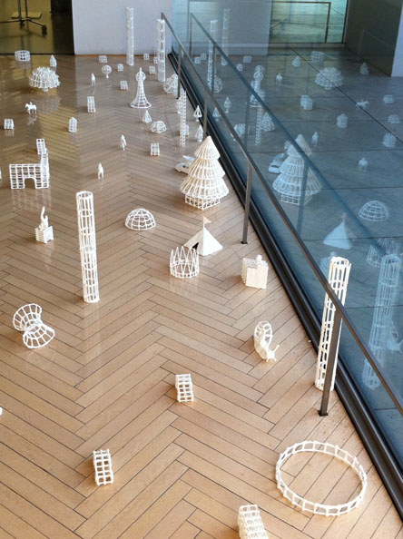 レストランエントランスのアプローチ。室内から眺めると、並べた立体がガラス面に反射している。