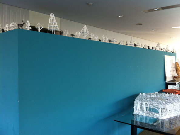 レストランの厨房との結界の壁の上には動物と木の立体。手前のガラスのテーブルには森を作ったジオラマの立体。横から覗くと、ガラス面が池の水のように反射する。
