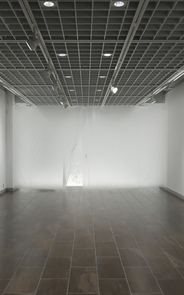 外観。クリュニーの中世美術館にある《貴婦人と一角獣》のタペストリー6点のうち《我が唯一の望み》とされる作品から。その中に描かれている、入り口の開かれた幕屋をモチーフに、会場を半透明の幕で仕切った。実際のタペストリーでは中の様子は分からないが、こちらのインスタレーションでは中に入れるようにした。