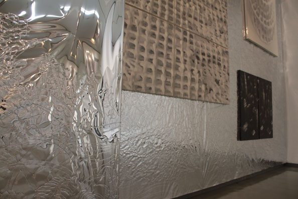通路から入った展示室の銀色に輝く壁面に描かれているのは、大阪の金剛寺にある『日月山水図屏風』をもとにした絵。この六曲一双の屏風は、右隻に春と夏の自然と太陽が、左隻に秋と冬の自然と月が描かれている。自然に畏怖を感じ、そこに神性を見出すとともに、この作品では昼と夜、四季といった時間の移ろいが一双の中に現され、時空を超えた永遠の世界が表現されている。そんな様子を浄土をあらわすこの部屋の壁面に描いた。それぞれ太陽と月を現す部分には、丸いパネルの作品がかかっている。自分を含めた周りの景色を映すこの壁面は、空間に永遠の広がりを与え、また平泉の中尊寺金色堂のような、きらびやかな浄土世界を表現しています。