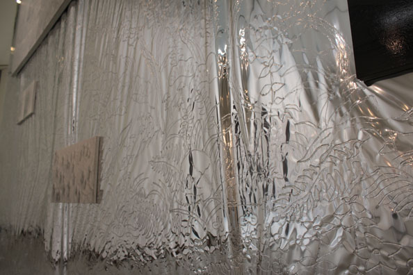 通路から入った展示室の銀色に輝く壁面に描かれているのは、大阪の金剛寺にある『日月山水図屏風』をもとにした絵。この六曲一双の屏風は、右隻に春と夏の自然と太陽が、左隻に秋と冬の自然と月が描かれている。自然に畏怖を感じ、そこに神性を見出すとともに、この作品では昼と夜、四季といった時間の移ろいが一双の中に現され、時空を超えた永遠の世界が表現されている。そんな様子を浄土をあらわすこの部屋の壁面に描いた。それぞれ太陽と月を現す部分には、丸いパネルの作品がかかっている。自分を含めた周りの景色を映すこの壁面は、空間に永遠の広がりを与え、また平泉の中尊寺金色堂のような、きらびやかな浄土世界を表現しています。