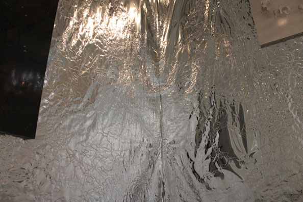 通路から入った展示室の銀色に輝く壁面に描かれているのは、大阪の金剛寺にある『日月山水図屏風』をもとにした絵。この六曲一双の屏風は、右隻に春と夏の自然と太陽が、左隻に秋と冬の自然と月が描かれている。自然に畏怖を感じ、そこに神性を見出すとともに、この作品では昼と夜、四季といった時間の移ろいが一双の中に現され、時空を超えた永遠の世界が表現されている。そんな様子を浄土をあらわすこの部屋の壁面に描いた。それぞれ太陽と月を現す部分には、丸いパネルの作品がかかっている。自分を含めた周りの景色を映すこの壁面は、空間に永遠の広がりを与え、また平泉の中尊寺金色堂のような、きらびやかな浄土世界を表現しています。
