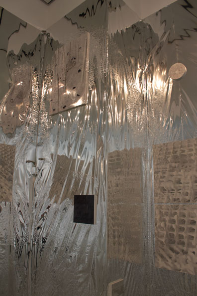 通路から入った展示室の銀色に輝く壁面に描かれているのは、大阪の金剛寺にある『日月山水図屏風』をもとにした絵。この六曲一双の屏風は、右隻に春と夏の自然と太陽が、左隻に秋と冬の自然と月が描かれている。自然に畏怖を感じ、そこに神性を見出すとともに、この作品では昼と夜、四季といった時間の移ろいが一双の中に現され、時空を超えた永遠の世界が表現されている。そんな様子を浄土をあらわすこの部屋の壁面に描いた。それぞれ太陽と月を現す部分には、丸いパネルの作品がかかっている。自分を含めた周りの景色を映すこの壁面は、空間に永遠の広がりを与え、また平泉の中尊寺金色堂のような、きらびやかな浄土世界を表現しています。