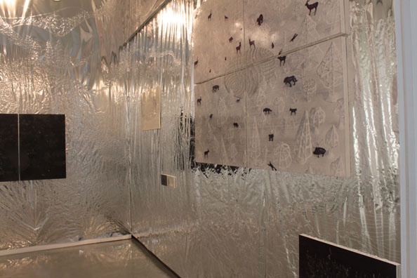 通路から入った展示室の銀色に輝く壁面に描かれているのは、大阪の金剛寺にある『日月山水図屏風』をもとにした絵。この六曲一双の屏風は、右隻に春と夏の自然と太陽が、左隻に秋と冬の自然と月が描かれている。自然に畏怖を感じ、そこに神性を見出すとともに、この作品では昼と夜、四季といった時間の移ろいが一双の中に現され、時空を超えた永遠の世界が表現されている。そんな様子を浄土をあらわすこの部屋の壁面に描いた。それぞれ太陽と月を現す部分には、丸いパネルの作品がかかっている。自分を含めた周りの景色を映すこの壁面は、空間に永遠の広がりを与え、また平泉の中尊寺金色堂のような、きらびやかな浄土世界を表現しています。