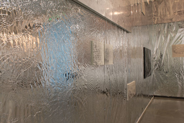 展示室に入って右手の壁面。銀色の壁面側の方面に振り返って左側の壁面。