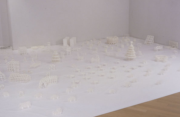 美術館の展示室の奥を区切り、白い布を床に敷き詰め、真っ白な空間を作りそこに白い立体を並べた。初めてのインスタレーション展示。