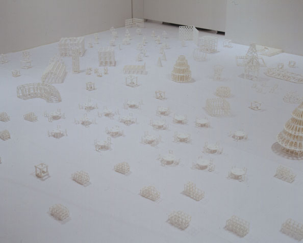 美術館の展示室の奥を区切り、白い布を床に敷き詰め、真っ白な空間を作りそこに白い立体を並べた。初めてのインスタレーション展示。