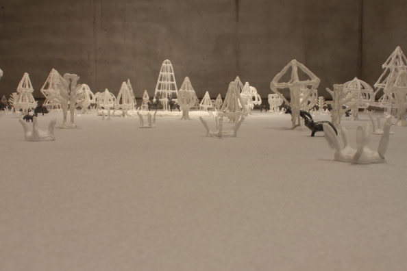 地下室のインスタレーション。地下へ続く薄暗い階段とその先にある木々と動物のインスタレーションは、、桃源郷へ続く狭い入り口とその先にある桃源郷として見立てている。