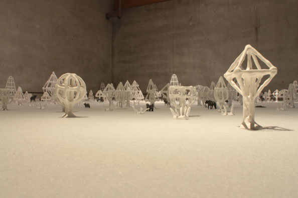 地下室のインスタレーション。地下へ続く薄暗い階段とその先にある木々と動物のインスタレーションは、、桃源郷へ続く狭い入り口とその先にある桃源郷として見立てている。